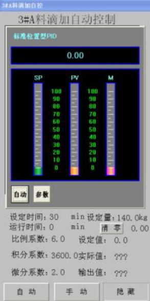 6. 操作員手動(dòng)點(diǎn)選界面內(nèi)反應(yīng)釜,進(jìn)入自動(dòng)控制界面,例:自動(dòng)滴加,在溫度實(shí)時(shí)曲線界面。在時(shí)間、滴加量設(shè)定行,對反應(yīng)所需達(dá)到量按照不同工藝要求進(jìn)行設(shè)定。點(diǎn)選手動(dòng)自動(dòng)按鈕選至自動(dòng)狀態(tài),則整個(gè)過程自動(dòng)滴加,依據(jù)現(xiàn)場實(shí)際情況可點(diǎn)選手動(dòng)狀態(tài)適當(dāng)調(diào)節(jié)更精確的實(shí)現(xiàn)現(xiàn)場的調(diào)節(jié)效果。(參數(shù)設(shè)定完成后,務(wù)必隱藏界面,該操作系統(tǒng)最多同時(shí)打開20 個(gè)界面)