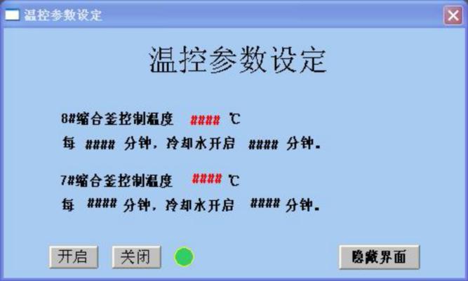 7. 溫度控制:操作員根據(jù)操作工藝設(shè)定好控制溫度,并根據(jù)現(xiàn)場實(shí)際溫度控制情況設(shè)定控制時(shí)間,點(diǎn)選開啟,指示燈亮進(jìn)入溫控自動(dòng)流程。